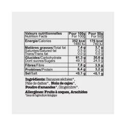 Bananes sĂ©chĂ©es*, pâte de dattes*(67,4%), noix de cajou*(6,7%), poudre d’amande*, gingembre*(0,3%).