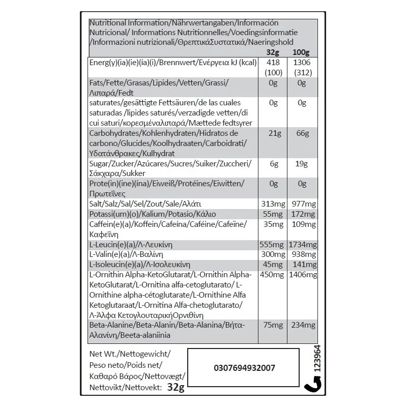 L’acide aminé Beta-alanine* aide à la formation de la carnosine (fort pouvoir anti-oxydant), pendant que les OKG (alpha ketoglutarate ornithine) favorisent la reconstruction musculaire. Ce paquet de 100 calories contient des glucides (maltodextrine et fructose) qui utilisent des filières non concurrentes pour maximiser l’assimilation et l’utilisation des glucides et diminuer le stress de l’estomac.