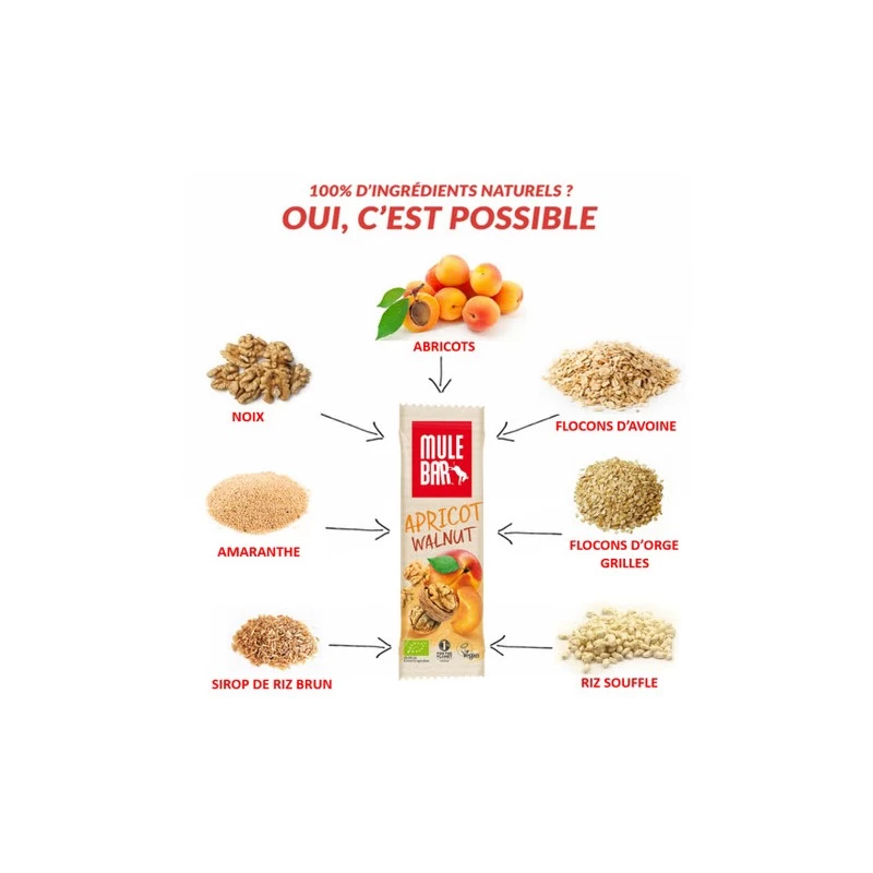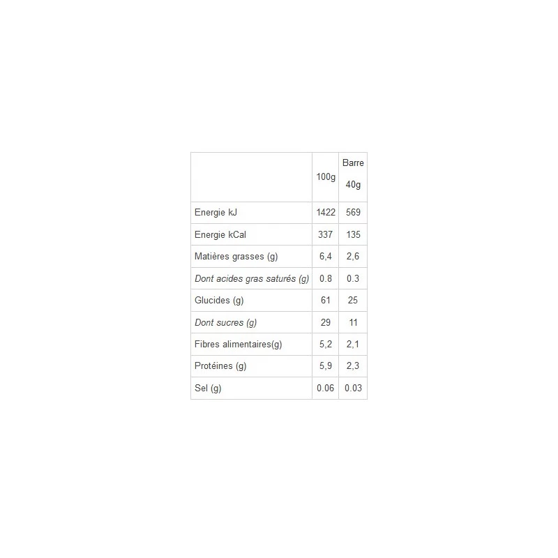 Abricot 32%, Sirop de riz, Farine d’avoine 16%, Noix 7%, Riz soufflé (Farine de riz, sucre, extrait de malt, huile de tournesol, Lecithine de tournesol) 7%, Avoine 4%, Farine de soja, Eau, Amarante soufflée 1%, Huile de tournesol