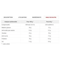 Ingrédients : cacahuètes 37.1%, sirop de riz, graines de courge 9.3%, amandes 7.4%, maltodextrine, billettes de riz (farine de riz complet, farine de maïs, sucre de canne, sel de mer), noix de cajou 4.5%, graines de sésame 1.1%, sel de mer, huile de tournesol, graines de chia 0.7% (salvia hispanica), épices, sel, arômes. Fabriqué dans un atelier qui utilise : lait, oeuf, soja. Conformément à la réglementation ce produit contient moins de 20 mg/kg de gluten.